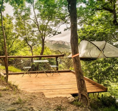 Una vacanza con la tenda sull'albero! Le nostre tende sono collocate su antichi terrazzamenti con muri a secco tipici del territorio ligure e potete godere della vista sulla vallata che scende al mare mediterraneo.